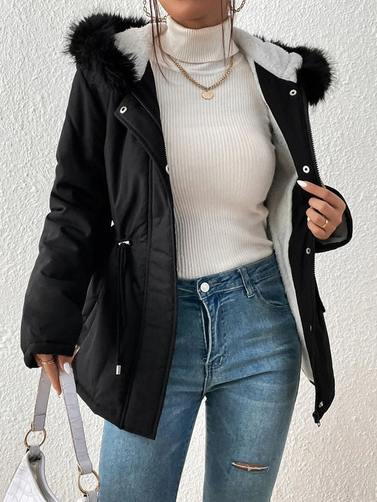 Essnce Drawstring Waist Fuzzy Trim Hooded Parka Coat